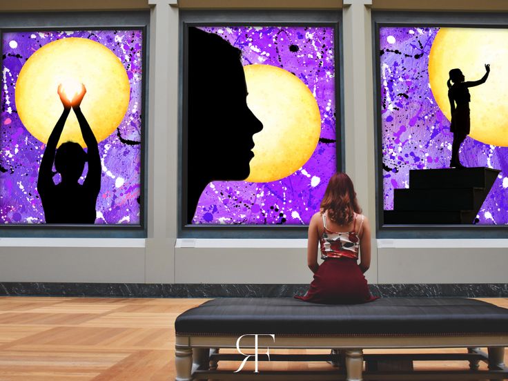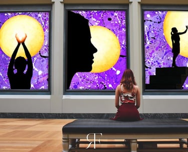 This artwork delves into the profound connection between humanity and the cosmos, portraying the moon as a silent confidant of our deepest emotions, dreams, and reflections. The vibrant purple splashes in the background symbolize the universe's boundless energy, chaotic yet beautiful, surrounding the golden moon—a beacon of hope and understanding. The silhouettes in the artwork embody the different stages of self-discovery and aspiration. On the left, the figure reaches upward, embracing the light of the moon, symbolizing hope, desire, and the pursuit of purpose. The central profile represents introspection, a quiet moment of connection where the moon becomes a mirror reflecting the self's truths. On the right, the ascending figure on the staircase signifies progress, resilience, and the courage to move forward, even when the path is uncertain. "Talking to the Moon" invites viewers to explore their inner dialogues, those quiet conversations held under the night's embrace. The moon, a timeless witness, becomes a symbol of unwavering presence, listening as we pour our hopes, fears, and dreams into its gentle light. This piece reminds us that even in solitude, we are never truly alone—the universe is always listening.